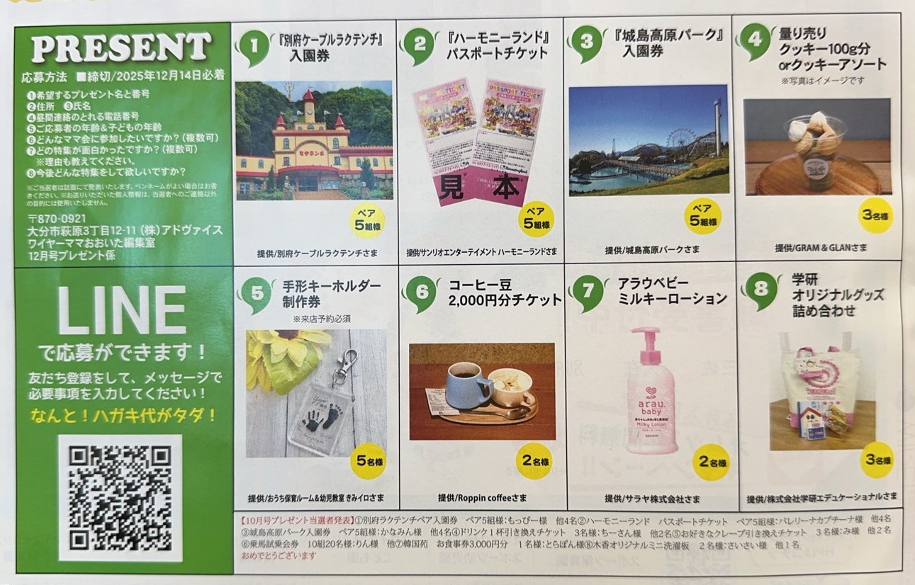 読者プレゼント プレゼント応募フォーム 応募締切12月14日 希望するプレゼント名 ①別府ラクテンチ 入園券②サンリオエンターテイメントハーモニーランド ハーモニーランドパスポートチケット③城島高原パーク 入園券④GRAM&GLAN 量り売りクッキー100g分orクッキーアソート引き換えチケット⑤おうち保育ルーム&幼児教室きみイロ 手形キーホルダー制作券⑥Roppin coffee コーヒー豆2,000円分チケット⑦サラヤ株式会社 アラウベビーミルキーローション⑧株式会社学研エデュケーショナル 学研オリジナルグッズ詰め合わせ 郵便番号 住所 氏名 ペンネーム 昼間連絡のとれる電話番号 メールアドレス ご応募者の年齢(歳) 子どもの年齢(歳) どんなママ会に参加したいですか? 残文字数 : 300 どの特集が面白かったですか?理由も教えてください。 残文字数 : 300 今後どんな特集をして欲しいですか? 残文字数 : 300 ・第三者に情報を提供することはございません。 ・応募いただいた方のプライバシーは厳守致します。